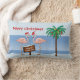Vreemd genoeg kerstcadeautjes van een warm klimaat of een tropische locatie. Fun en griezelig. Twee roze vlammen liggen op het strand op het witte zand, met petten van de kerstman, en staan bij een palmboom die versierd is met vakantielichten, met de oceaangolven op de achtergrond. Een grappig teken in het zand zegt: Tropische Zuidpool. De opties, de Zachte Kerstmis, of het teken op het zand kunnen worden geschrapt indien gewenst voor een eenvoudiger ontwerp, of verander formuleringen als past het gebied of aan Tropische Noordpool. De achtergrond is de lichtblauwe kleur van de hemel om de voorkant aan te passen, of verandering in wit of om het even welke kleur.