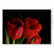 Cette carte de note magnifique comporte un bouquet des tulipes rouges d'écarlate et du feuille vert réglés sur un arrière - plan noir pur.