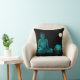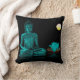 Gooi de kussen met turquoise Buddha op de voorkant tegen een zwarte achtergrond en een turkooispringspatroon op de achterkant.