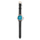 Dit vrouwenhorloge heeft een modern design uit de midden eeuw van verspreide mazen op een terrein van turquoise.