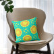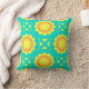 Levendige vormgeving van de draaiende kussens met een naadloos patroon van geometrische vormen in oranje en geel op een turkooisachtergrond.