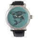 Een zwart-wit tattoo ontwerp van een orka of andere vis op een decoratief turquoise horloge