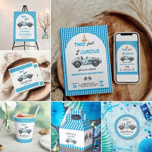 Twee Fast Blue Race Car 2e verjaardag uitnodiging Bedankdoosjes