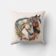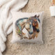 Een kussen met een afbeelding met een paardenpaar. Het dragen van decoratieve hoofdbanden. Omgeven door veren en bladeren.