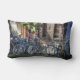 Serie Amsterdam: Een grote gooikussens met een kenmerkende tableaux in Amsterdam - twee serveersters nemen een pauze achter een stand van de alomtegenwoordige fietsen die zo vaak voorkomen in deze eerlijke stad. De meisjes worden op een privémoment gevangen door de zonnige piek door de wolken.