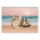 Chat rayé assis sur la plage avec coucher de soleil. Un cadeau parfait pour les amoureux de les chats.