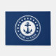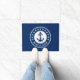 Gepersonaliseerde deurmat met uw bootnaam of familienaam en een op maat gemaakt nautisch anker met 13 sterren in het wit op een marineblauwe achtergrond.