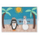 Un manchot et un bonhomme de neige en vacances sur une plage...
