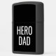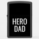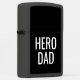 De zwarte zwarte vaderdag Typografie Zippo Lighter is ontworpen met een zwarte matte achtergrond en het gezegde "held dad" staat in witte letters op het voorste midden. Dit is een geweldig idee van een cadeautje voor Vaderdag. Beschikbaar in verschillende stijlen en kleuren.