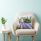 Een kussen met een schilderij van een huisje en lavendervelden.