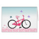 Un design mignon avec un vélo rose avec un siège et un cadre rose chaud, des pédales noires et des pneus noirs. Un arrière - plan bleu doux avec des petits papillons bleus qui volent.