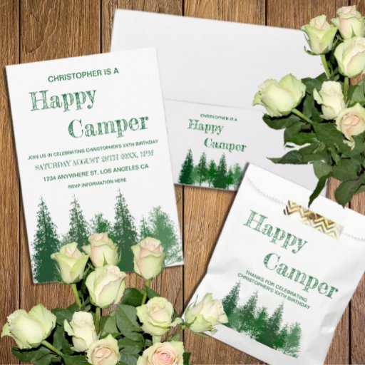 Gelukkige camperverjaardag met bosbomen in verschillende tinten groen
