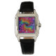 Dames zwart lederen bandhorloge met een afbeelding van levendige regenboogkleurige fractal draken met felroze staarten. Bekijk het gehele Fractal Art Watch collectie in de sectie ACCESSOIRES.