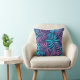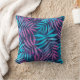 Front and back views of a pillow with a vibrant leaf pattern. Leaves in pink and blue shades cover a dark background, creating a tropical feel."