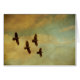 Foto van vier ravens die in formatie langs de wolken in een blauwe hemel vliegen. Een textuur werd toegevoegd aan dit afbeelding om het een antiek blik te geven.
