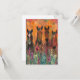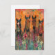 Op de kaart staat een kleurrijk schilderij van vier paarden in een bloemenveld. De paarden zijn geschilderd in een dynamische stijl met gedurfde kleuren en expressieve penseelstreken. Het algehele gevoel van het schilderij is er een van schoonheid en vrede. De achterkant van de kaart is leeg, zodat u berichten kunt schrijven of kunt tekenen.
