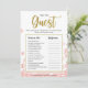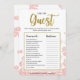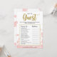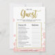 Dit moderne bloemige "Vind de Gast" bruidsfeest spel heeft een roze bloemige achtergrond met gouden glitter spetters. De tekst is geschreven in een mix van een speelse kalligrafische lettertype en een modern schreefloos lettertype, deze Vind de Gast kaart is gepersonaliseerd met de naam van de aanstaande bruid en de datum van het bruidsfeest.