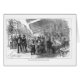 Een Wenskaart met een gravering in zwart-wit van een druk café op Boulevard Montmartre Paris, Frankrijk, ongeveer 1870.