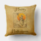 Een Halloween-heks met bezem en een volle oranje Halloween-maan, die je een Happy Halloween toewenst.