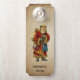 Een deurhanger met een Oude Wereld Kerstman. Klassieke oude wereld santa, het dragen van zijn beroemde rode jas en het dragen van een tas vol met speelgoed. Deze ouderwetse kerstman is slank en heeft een wandelstok voor het reizen door het land en schenkt speelgoed aan alle meisjes en jongens. Oude perkamentstijl achtergrond.