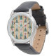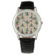 Het horloge van deze mannen heeft een modern design van kerstbomen en ornamenten uit de midden van de eeuw dat op een tuin met een gouden en zilveren achtergrond ligt.