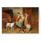 In de kunstwerken van Adolf Eberle staat een landelijke scène in een schuur waar een moeder op haar schoot een stoel zit met haar baby en de baby op een littertje puppies brengt. Een puppy zit op de schoot van de moeder samen met de baby. Twee oudere kinderen zijn in de buurt, en de moederhond staat rustig en geduldig in de gaten terwijl haar puppies met hun menselijke familie communiceren. Twee paarden in de schuur kijken ook. De Duitse kunstenaar Adolf Eberle (1843-1914) is geboren in München. Zijn vader, Robert Eberle, was ook schilder. De meest voorkomende en favoriete onderwerpen van Adolf waren familieleefscènes, waaronder jagers en boeren, uit het Beierse en Tiroolse boerenleven. Veel van deze scènes omvatten ook gezelschapsdieren. Deze kaart is leeg binnenin voor je eigen bericht.