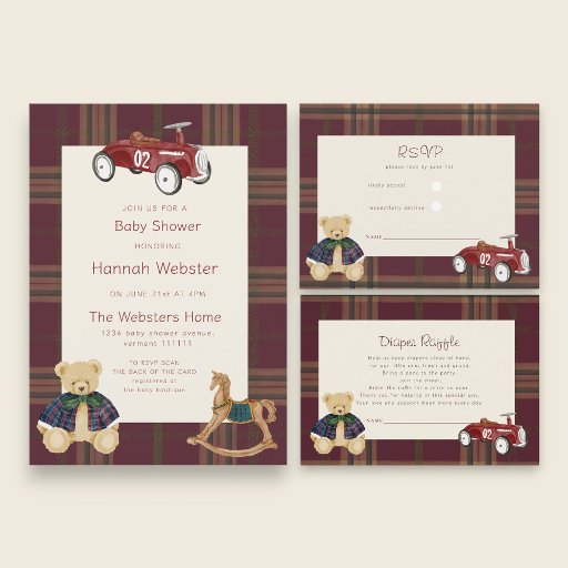 Set the tone for a joyous baby shower celebration with this nautical-themed invitation. The design showcases a classic red toy car with the number '02,' hinting at the start of a new adventure, framed by a rich burgundy and gold plaid pattern. Adorable graphics of a teddy bear and a wooden rocking horse add a touch of classic playfulness to the design. This invite is perfect for celebrating Hannah Webster's upcoming arrival, with all the essential details clearly laid out: 'Join Us for a Baby Shower,' date, time, and location. The mention of being 'Registered at the baby boutique' makes gift-giving straightforward for your cherished guests. you will need the rsvp responce card to go along with this invitation , as this card is formal rather than casual, there is a casualoption in my store if thats what your looking for.