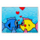 Hoe lief! Twee kleine vissen in visliefde. Blauwe en gele vis op een blauwe bellenachtergrond met drijvende harten. De tekst kan worden toegevoegd!