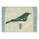 © Sue Schlabach/Wild Apple. Een oud beeld van een vogel die naar rechts kijkt. THis afbeelding heeft een blauwe rand en Franse tekst op de achtergrond.