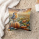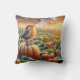 Een klein vogeltje op een pompoen zingt melodieuze muzieknoten die visueel de lucht in dwarrelen.