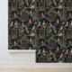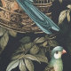 Elegant behang met illustraties van gouden vogelkooien en blauwe, rode en oranje vogeltjes op een zwarte achtergrond.