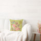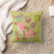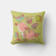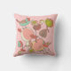 Een prachtig kussen met vogels van blauw, rood en roze met fruit, bladeren en verschillende stijlen en kleuren van bloemen.
