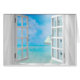 Fenêtre ouverte avec des rideaux clairs donnant sur un voilier et un phare blanc pour le Jour du Nom