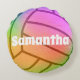 Veelkleurig volleybal rond kussen. Volleybal is een regenboog folie effect. Het woord volleybal kan worden verwijderd of gewijzigd in lettertypestijl en kleur. De achterkant van het kussen heeft jouw naam, maar u kunt het aanpassen aan uw trui nummer of gewoon de achterkant van het kussen met effen.
