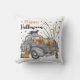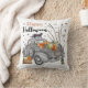 Geniet van dit moderne en leuke grijze vrachtwagen Halloween kussen! Waterverf afbeeldingen van een grijs truck met kleurrijke pompoenen in de rug en in een mandje aan de zijkant. Een waakzame zwarte kat loopt langs de bovenkant van de vrachtwagen terwijl vleermuizen door de lucht vliegen. Een bladloze herfstboom en verlichte lantaarn maken het tafereel compleet. Bovenaan in de oranje en zwarte Halloween-typografie staan de woorden Happy Halloween.