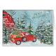 De voorkant van deze Siday-wenskaart is een indrukwekkend afbeelding van een winterlandelijke scène, compleet met een rode schuur, sneeuw bedekt met dennenbomen en een vrachtwagen gevuld met kerstgodies. De rode vrachtwagen staat geparkeerd in de sneeuw en sneeuwvlokken drijven er rond. Bovenaan staat de tekst "Vrede op Aarde". De binnenkant van de kaart heeft vier tekstgebieden voor u aan te passen.