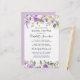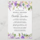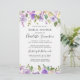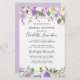 Zeer combinatie van donkere paarse rozen, lichte paarse rozen en ivoorwitte bloemen. Ze worden allemaal in verschillende groene bladeren gehakt. Samen creëer ze bloemgrenzen langs de boven- en onderkant van deze bruidelijke doucheuitnodiging. De naam van de bride wordt geschreven in een grote manuscriptdoopvont.