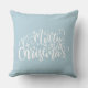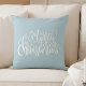 Licht blauw kussen in landschapstijl. "Vrolijk kerstfeest" citaat tekst geschreven als kalligrafie woordvoerder. Vind meer overeenkomende objecten in mijn Collectie "Kerstmis in rood, blauw en wit"