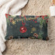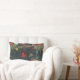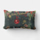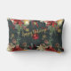 Een kerstwintervakantie decor gooi kussen met een bos bos winter 's nachts achtergrond met glinsterende gouden sneeuwvlokken, poinsettia's, lantaarns, dennenappels en rode bessen met een rode bal ornament Prettige feestdagen op rood lint vallen met Merry Christmas en in een glinsterende gouden penseelstreek aan de voor- en achterkant. De voor- en achterzijde zijn verschillend geslepen.