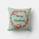 Een kussen met een seizoensgebonden hoogtepunt gemaakt met waterverven. Rode bloemen en groene bladeren in een cirkelvormige vorm met Merry Kerstmis, geschreven in een trendy moderne, handgeschreven lettertype.