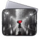 Het silhouet van een vrouw die op een donkere regenachtige stadsstraat loopt met een rode paraplu in selectieve kleur. lantaarnpalen verlichten de natte bestrating.