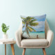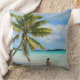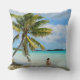 Gooi het kussen van een vrouw in bikinis onder een hangende palmboom in het ondiepe water van de lagune op het strand van een tropisch eiland in de stille archipel Frans-Polynesië.