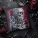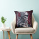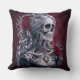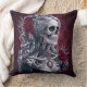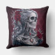 Vrouw Skull Cameo in het Rode Sierkussen. © Dark Heart Desires. Een gotisch werpkussen in rood met een cameo van een vrouwen skelet met zilverkleurig haar versierd met sieraden en rozen erop.