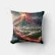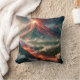 Een majestueuze vulkaanuitbarsting domineert het tafereel, met levendige rode lava die langs de hellingen stroomt en een rookpluim die de lucht in stroomt. Het omringende landschap is weelderig met groen, contrasterend met de vurige uitbarsting