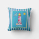 Een kussen met een nautisch thema. Ontworpen met een blauw gestreepte patroon en een blauw lijst met een gele rand die over de bovenkant is gelaagd. Een rode gestreepte vuurtoren en een strandbal, een glimlende zon en een vliegende schedel op de afstand in het lijst. Personaliseer met een naam of een andere tekst.