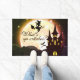 Hier is een 24-inch x 36-inch deurmat - net op tijd voor Halloween met een heks die op een bezemsteel boven een kasteel vliegt voor een felle volle maan. De vleermuizen en bergen staan op de voorgrond. Het portier heeft een slipvrije rug.