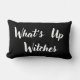 Schattige zwart-wit kussen met typografie. De tekst luidt: What's Up Witches. Deze feestelijke en leuke deurmat is perfect voor oktober en Halloween. Mat is zwart en typografie is wit schrift.