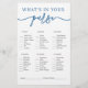 Een leuk en interactief bruiloftsspel dat iedereen hun tassen laat doorzoeken! Dit Wat zit er in je tas? afdrukbare spel heeft een modern “iets blauw” ontwerp met gelaagde puntwaarden om de competitie levendig te houden.