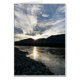 Zwemwitte wolken strekken zich uit over een blauwe hemel, boven een berggebied waar de zon zich vestigt, en werpen een reflecterende gloed op het oppervlak van de rivier. Een rotsachtig strand van rond gemaakte stenen in de voorgrond. Een adembenemend mooie natuur landschapsfoto die alle vier elementen water, aarde, vuur (zon) en wind in glorieus detail weergeeft.