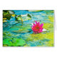 Een fuchsia-waterlelaar met kalkgroen foliage in turkooiswater.